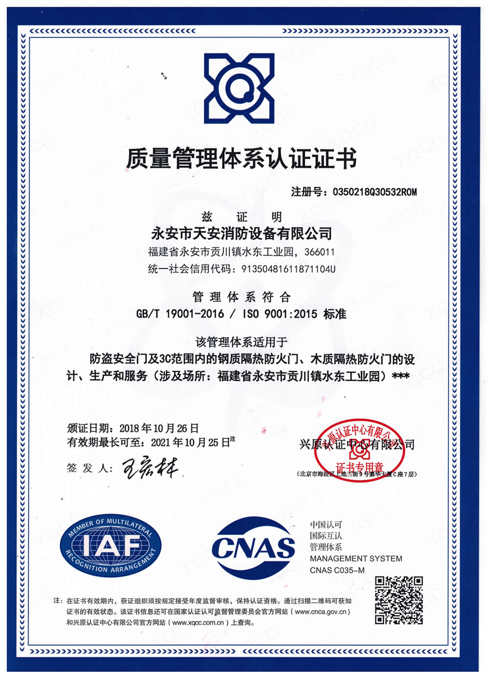 质量管理认证书