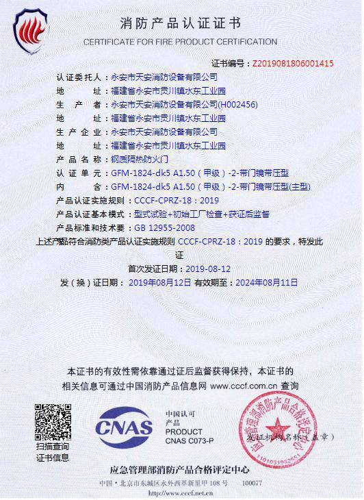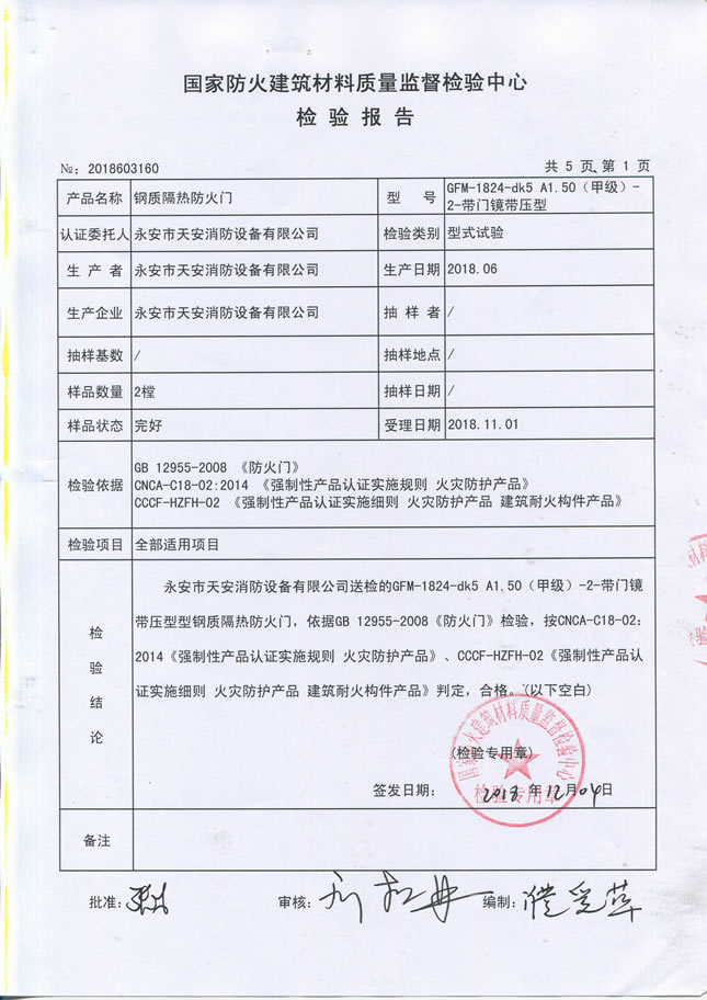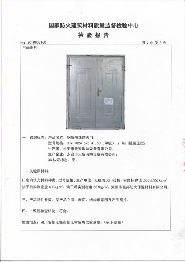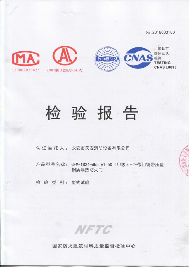 1824甲级-70-防火入户门检验报告及认证证书